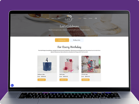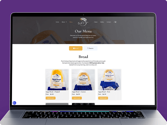 A structured product catalogue was developed to organize the bakery’s offerings across multiple categories including bread, savoury pastries, and celebration cakes. Each product page presents clear pricing, product options, and a straightforward path to purchase.