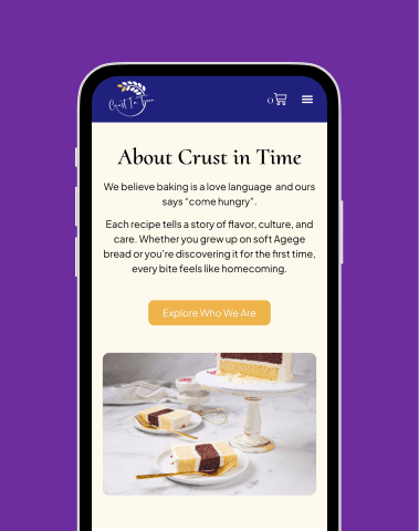 We designed and developed a visually inviting e-commerce website that reflects the warmth and authenticity of the Crust in Time brand. The layout combines rich imagery with clean navigation, allowing customers to easily explore bread, pastries, and cakes from any device.