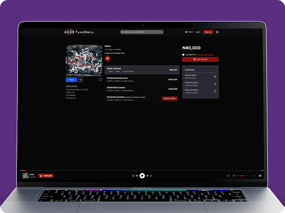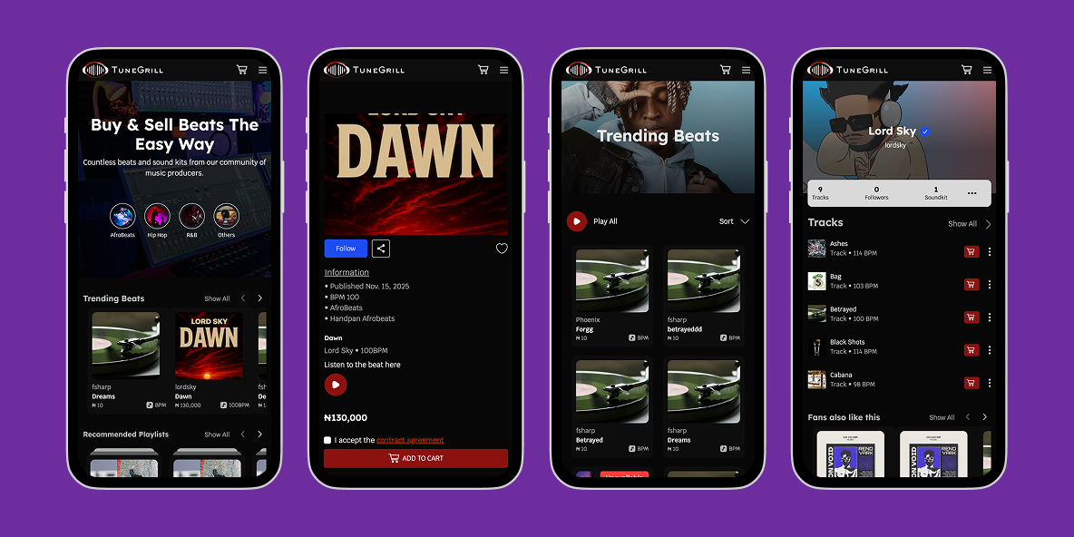 TuneGrill is a digital platform designed for music producers to monetize their creativity by selling beats, sound kits, and music assets to a global audience. The platform connects producers and buyers in a seamless environment where music can be discovered, streamed, and purchased.